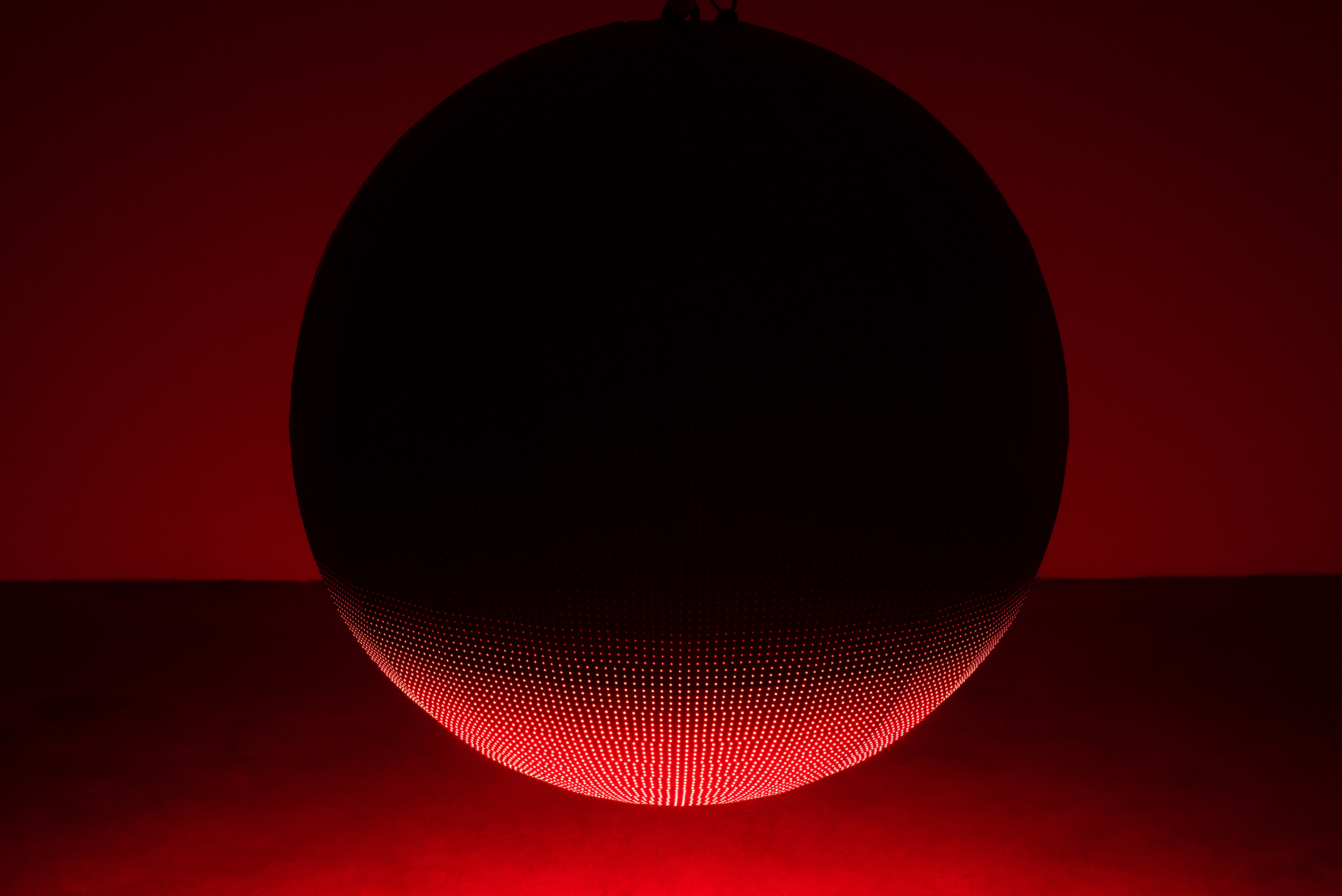 Cada ciclo de Punto de Fuga II pasa a través de una rojeza que envuelve la base de la esfera y también la atmósfera de la sala. Como si estuviéramos llegando a Marte, alrededor de los destellos del LED, pero también gravitando por el cosmos, ansiando un encuentro futuro con aquel lugar, expectando un nuevo tipo de vida y comunicación. Las formas convexas atrapan, evocan otras circunferencias y acogen entre sus arcos abiertos, que serpentean y seducen en el flujo de sus oscilaciones, sin la rigidez que suponen los ángulos rectos.