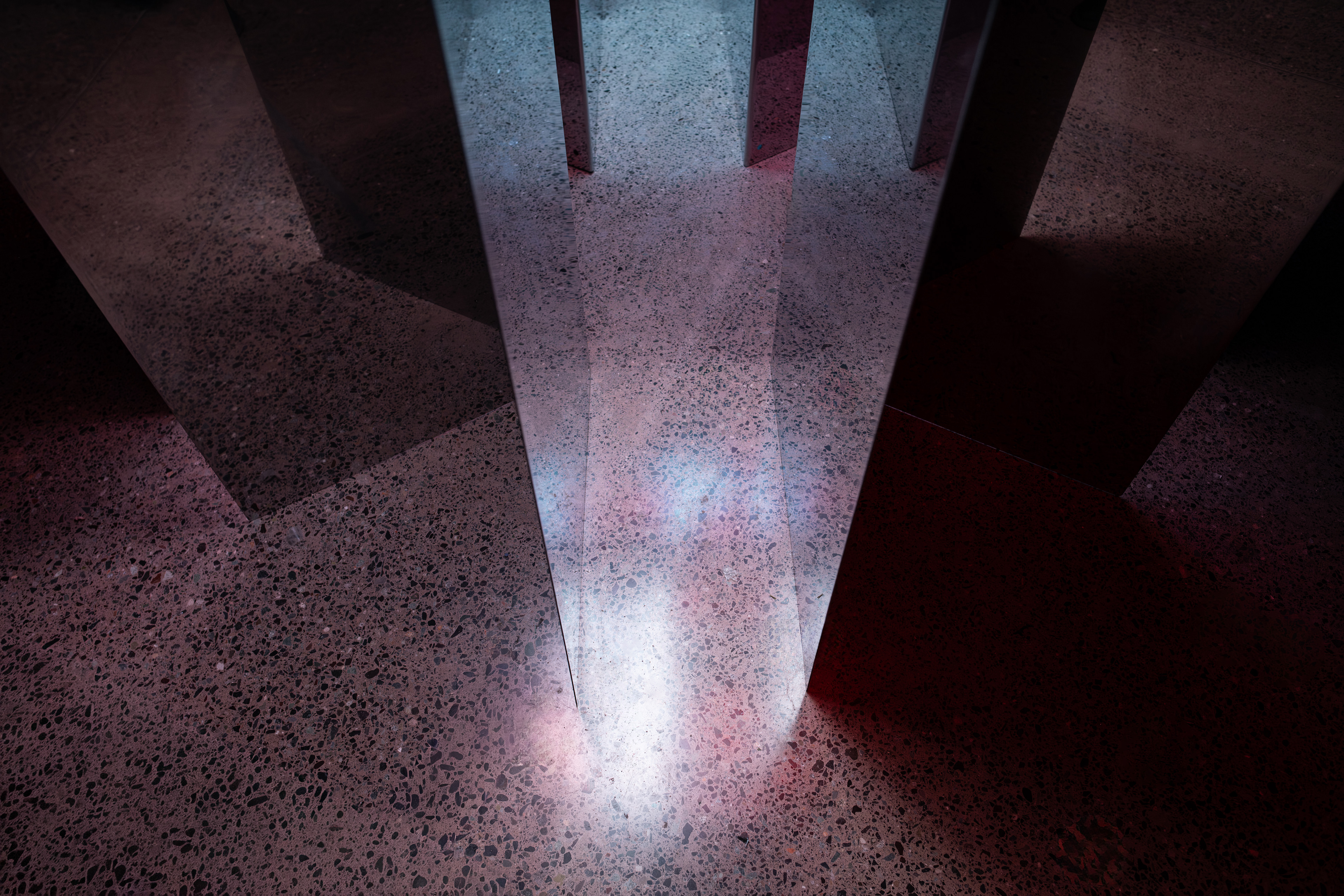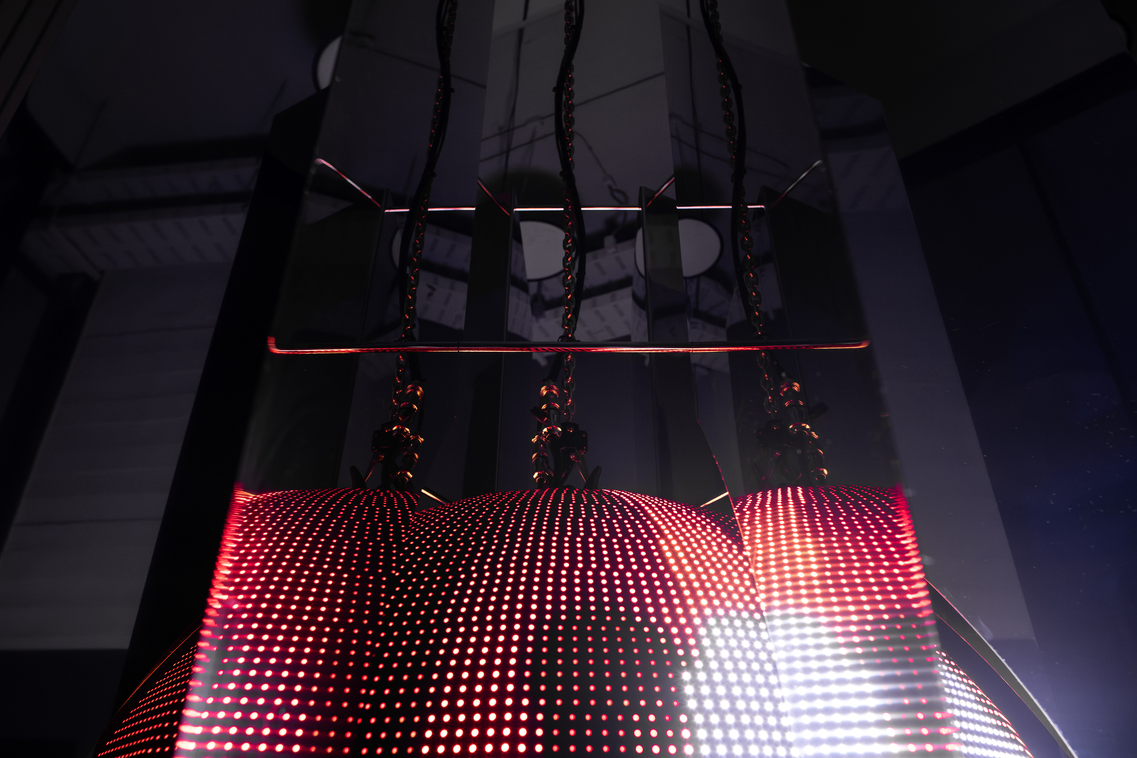 Aquí se trabajan tanto materialmente como postproducción elementos que permiten tener una experiencia expandida con objeto pantalla, así como algunos guiños o citas al cine experimental, la música incidental orquestada y la ciencia ficción. De esta forma, se fugan o se cuelan imágenes de manos y sombras que entran en contacto con esta distorsión espacio temporal, que se acarician o que solo se posan sobra la pantalla; que acompañadas de sonidos y ruidos se fragmentan en sus reflejos sobre una estructura de metal, multiplicándose en un juego de distorsiones, percepciones y espejismos. La esfera desfigurada y expandida como punto de gravedad simbólica, encierra o guarda una densidad difícil de medir en tanto nos conmueve, nos toca, nos llama, nos seduce o nos cuestiona manifestando un estado de singularidad ante la mirada de los visitantes.
